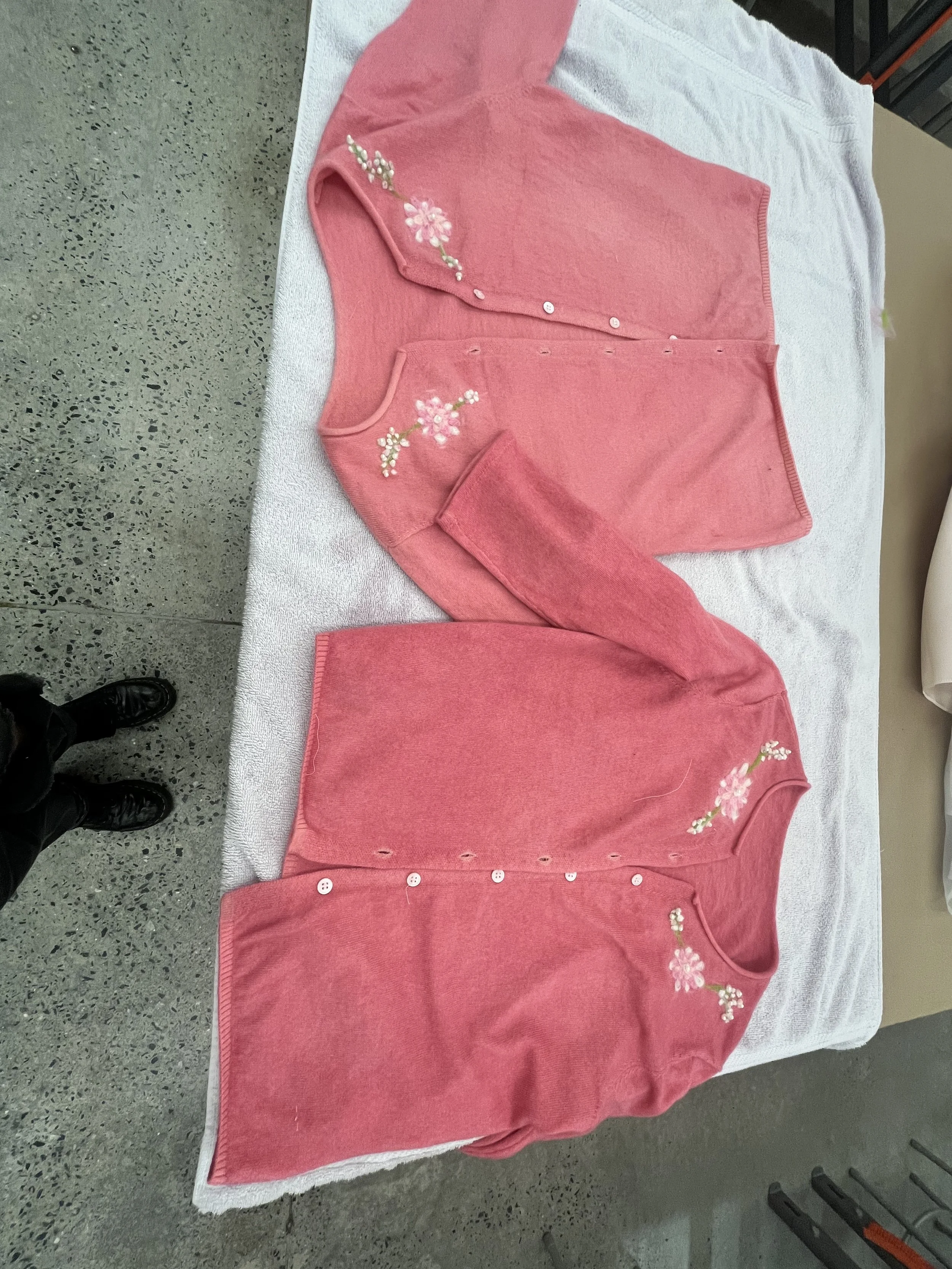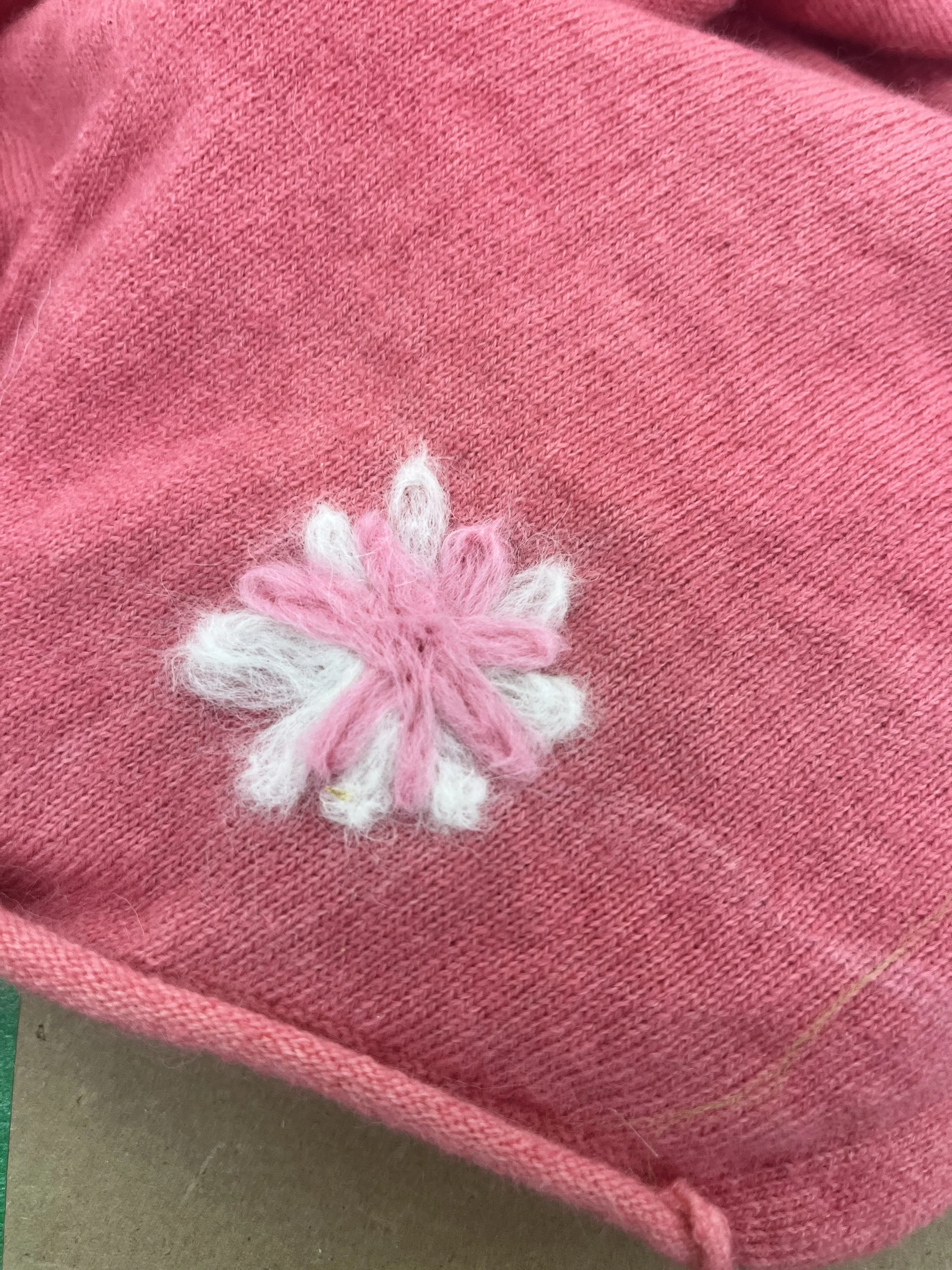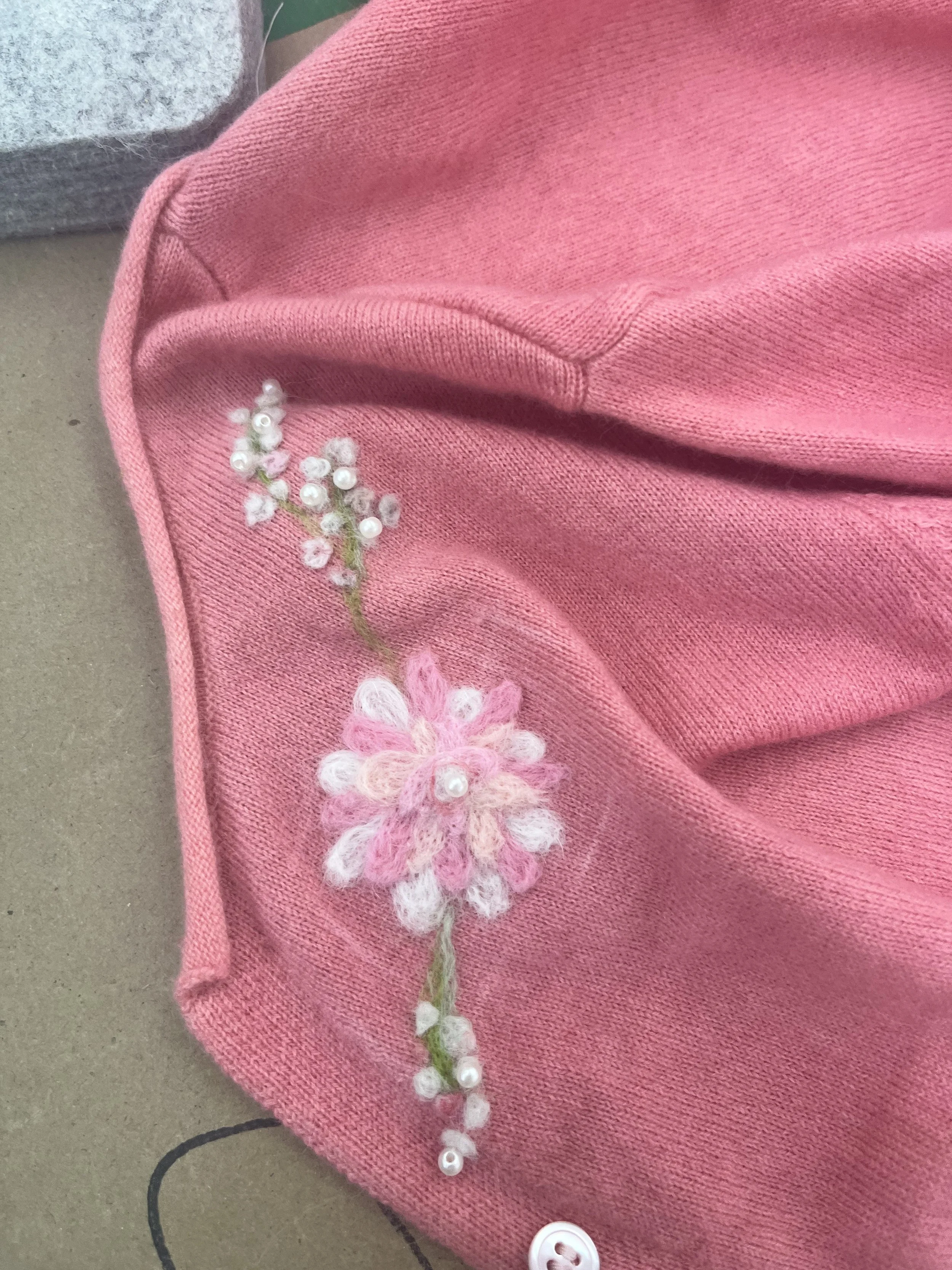 Flowers needle felted onto a sweater for SCAD’s production of Mauritius. They were built up layer by layer and all in all took about 6 hours to finish two duplicate sweaters.