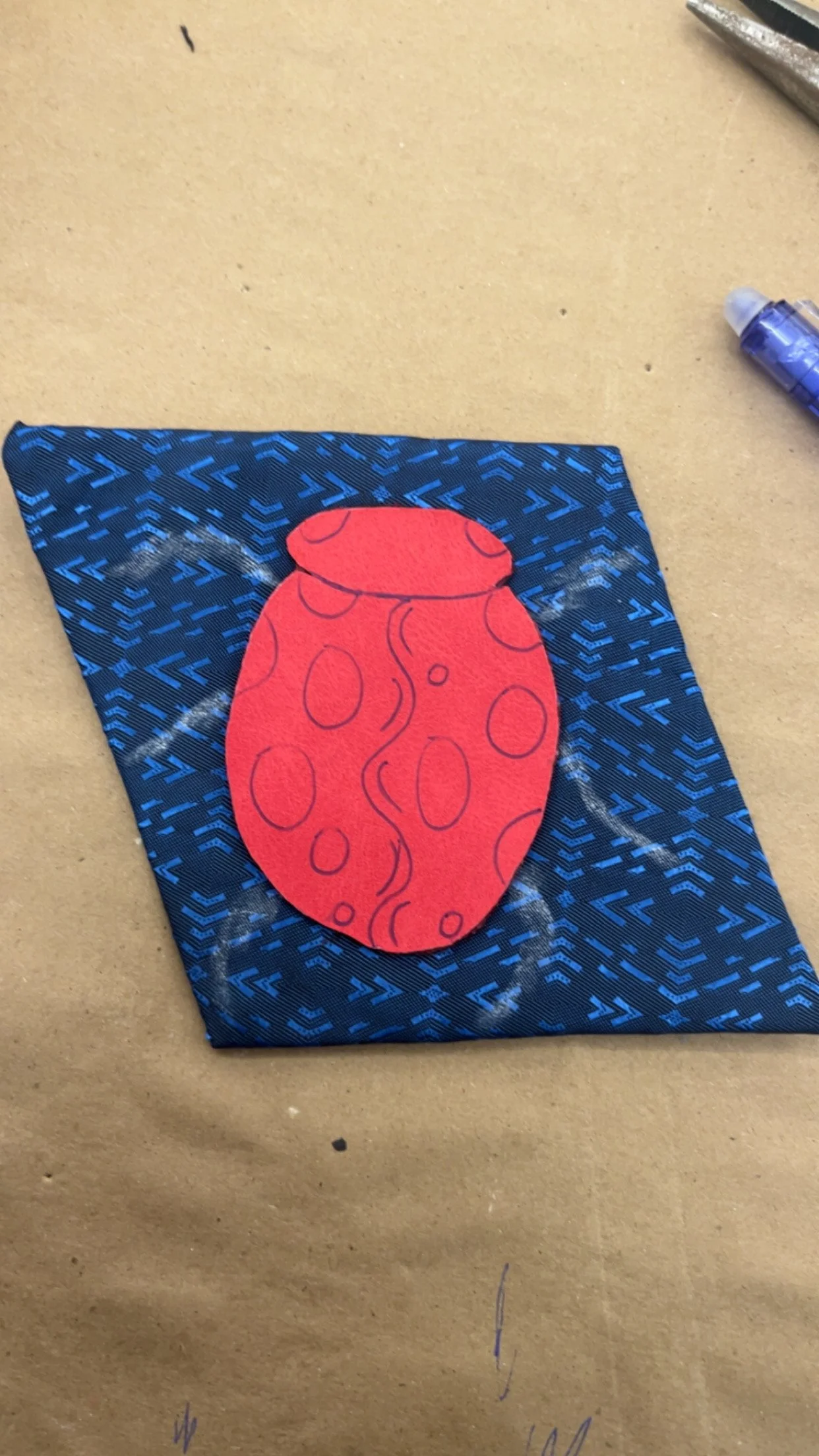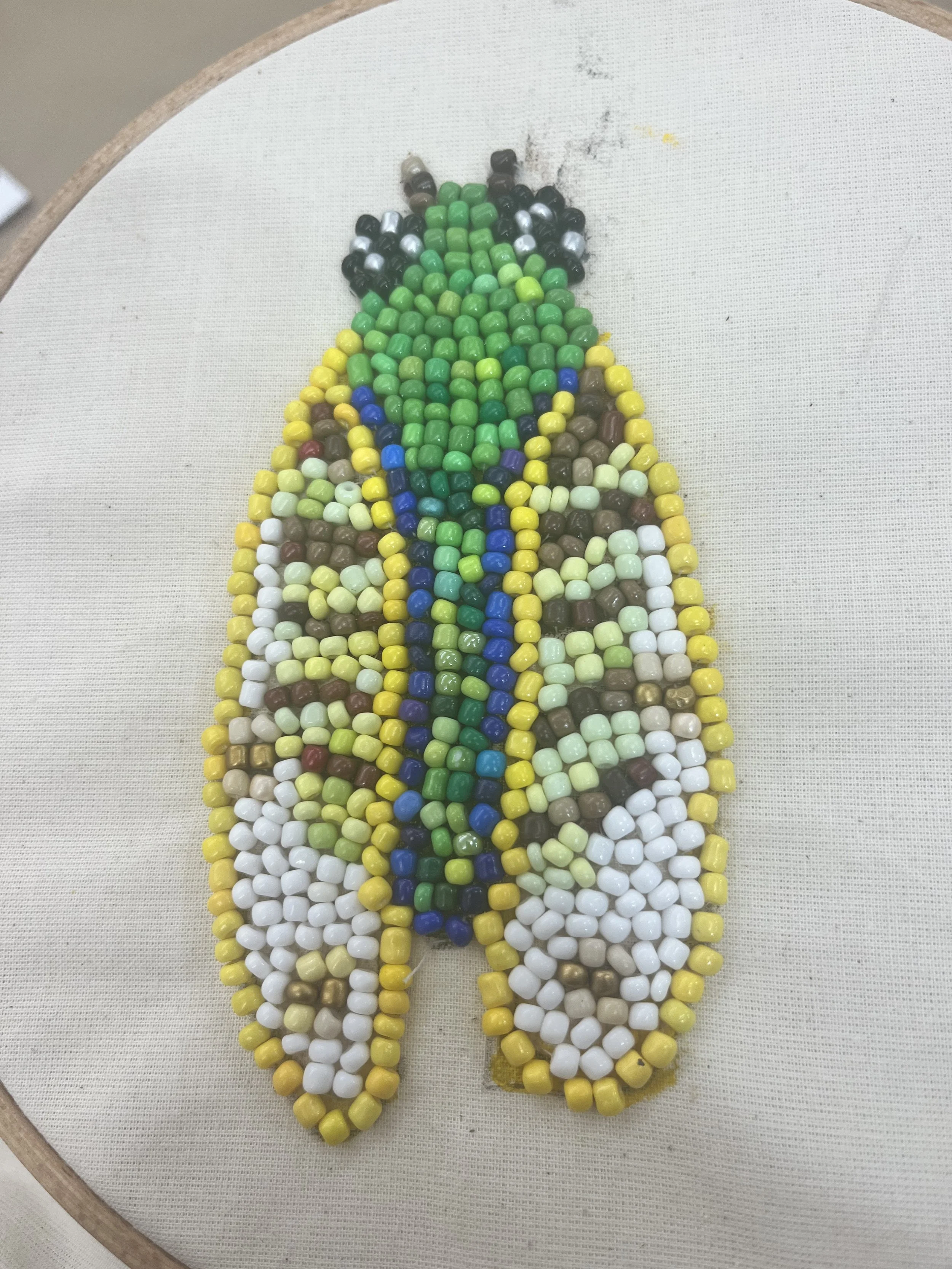 Beaded cicada patch made for SCAD’s production of Mauritius. Made with czech seed beads on muslin, the process took about 4 hours. Final piece measures 4”x3”